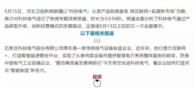 以下,是在4月底,由叄顏影視與河北衛(wèi)視共同參與拍攝的科林電氣新聞專題片,并于2019年5月17日晚間《河北新聞聯(lián)播》中播出。